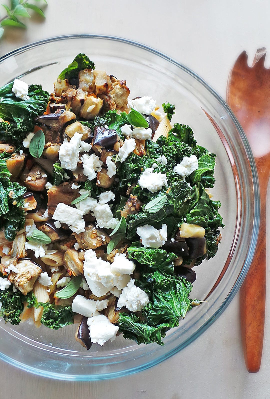 7. Once everything's finished, toss the kale/garlic, eggplant, and pasta in a large bowl. Sprinkle with feta, pine nuts, and squeeze over some fresh lemon.