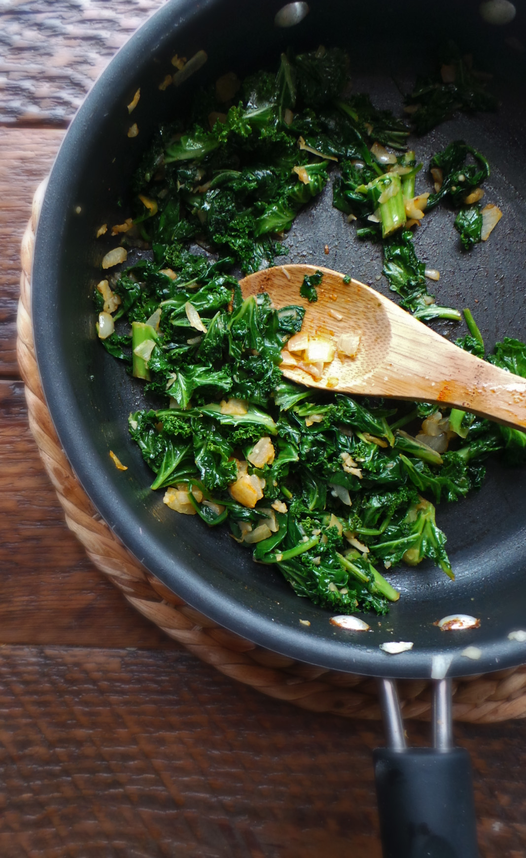 I cooked up the onions and garlic until they were golden and aromatic before tossing in bunches of my kale and spinach. Get creative here and use whatever you have on hand like some mushrooms, asparagus, brussels sprouts, leeks, or even POTATOES.