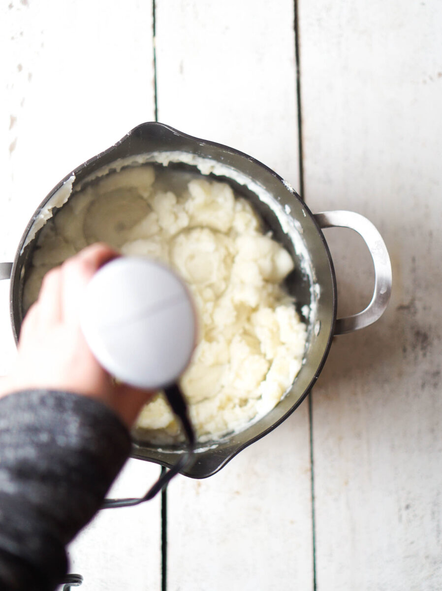 • Drain the potatoes and return to the pot. Remove the thyme from the almond milk. Mash the potatoes while slowing adding the milk. Mash until desired consistency achieved. I like mine creamy.